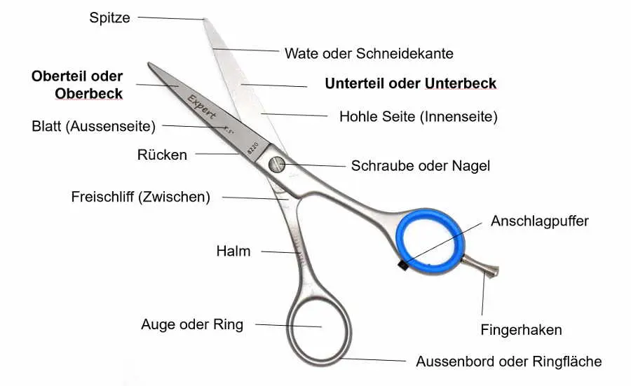 Die zwei Klingen der gebräuchlicheren Gelenkschere, die auf einer Achse über Kreuz angeordnet und drehbar sind, besitzen einen ringförmigen Griff, “Auge” genannt. An einem der Griffringe befindet sich bei vielen Ausführungen ein Anschlagpuffer als Schutz sowie ein Fingerhaken zur leichteren Handhabung. Die geschliffenen Seiten der Klingen liegen hier aneinander (Wate). Beim Benutzen der Schere öffnet sich das linke Blatt (bei einer Schere für Rechtshänder) nach unten, das rechte Scherblatt nach oben, wobei das vordere Ende beider Blätter eine Spitze bildet (Ober- und Unterbeck genannt). Dies ermöglicht es zu sehen, wo man schneidet. Auch durch Variieren des Drucks der Finger in den beiden Augen kann der Schneide-Andruck erhöht werden. Die beiden Blätter sind mittels einer Schraube verbunden. Als so genannter “Halm” wird der Abstand zwischen Griffring und Schraube bezeichnet, der in seiner Länge ebenfalls variieren kann (Beispiel Nagelschere – Haushaltsschere).