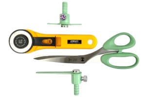 Mit einem starken Magneten einfach an der Schere oder am Rollschneider angebracht, ersparen Karl und Karlchen Zeit und Mühe, eine Nahtzugabe anzuzeichnen. Das «Schwert», das parallel zur Klinge der Schere oder dem Rollschneider steht, wird einfach am Schnittmuster entlanggeführt und der Schnittteil mit der vorher eingestellten Nahtzugabe ausgeschnitten.